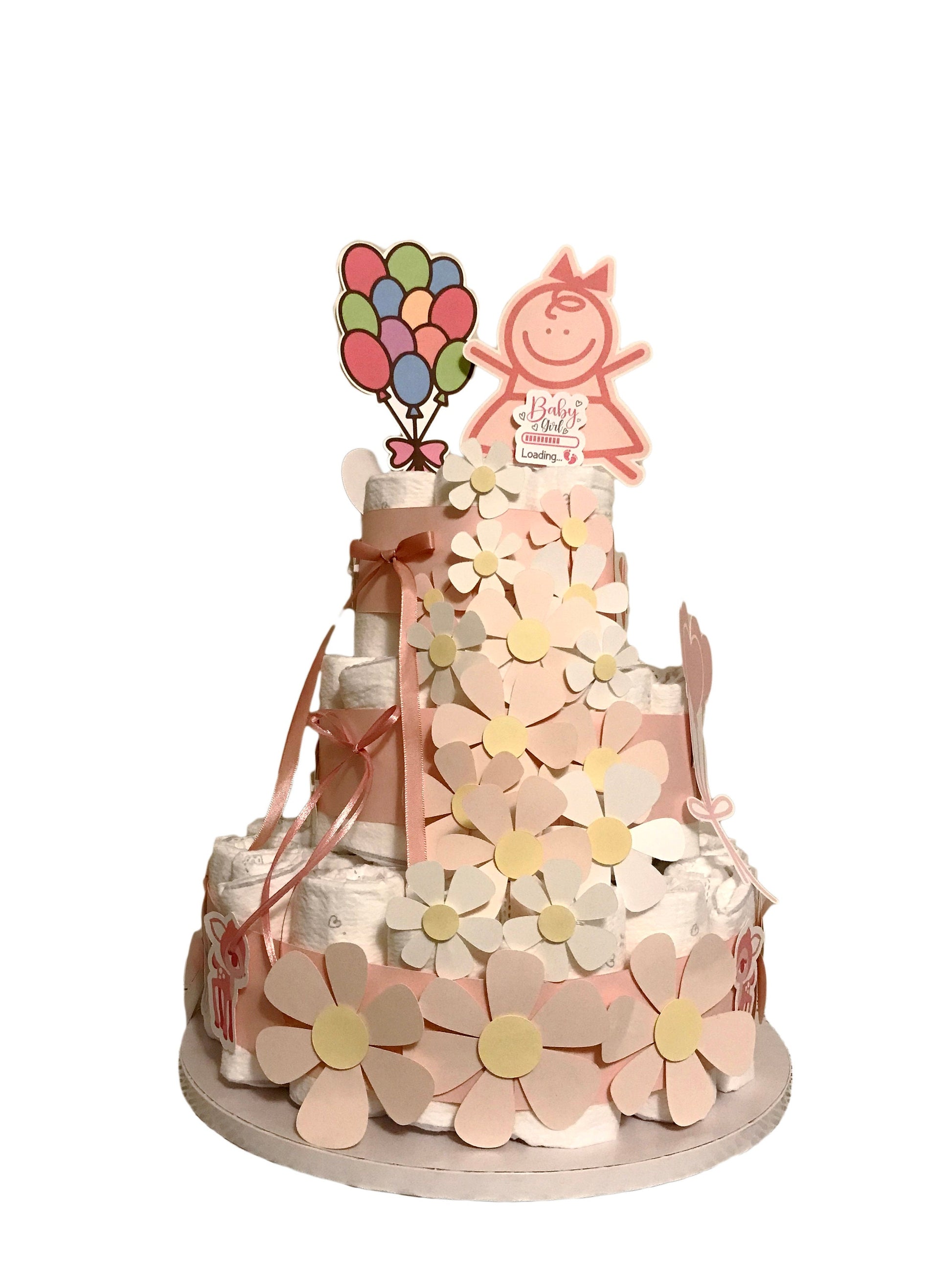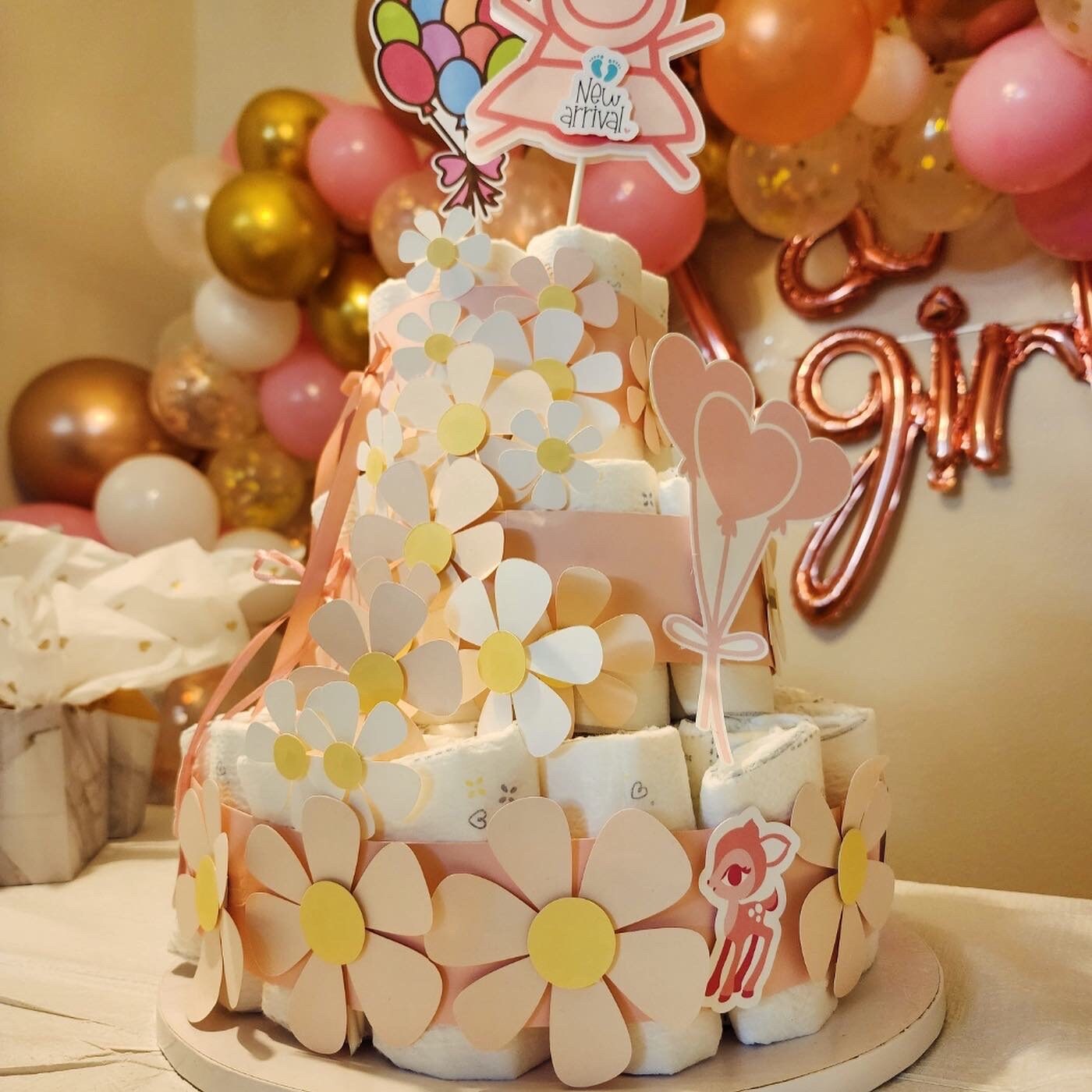 Looking for a unique welcome baby gift and/or baby shower/gender reveal decorations? Ideal to use as a simple, yet elegant centerpiece for a baby shower. After the event, the diapers can be used for the baby and the cake decorations can be used to accent the baby's memory book with mini messages of love!